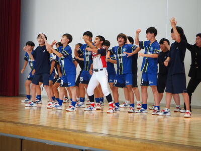 中総体を間近にひかえて壮行式が行われました。近年、部活動だけでなく、クラブチームをはじめとした多種多様な形態で活動している生徒が多いことから、「課外活動壮行式」と名称を変更したところです。