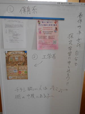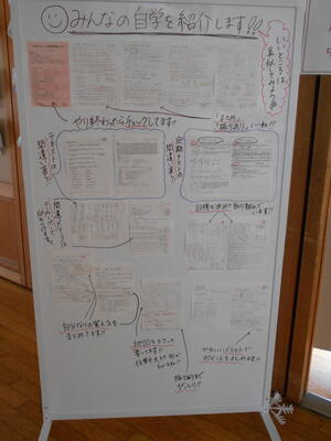 掲示板には、自学ノートを紹介し合うスペースも設けられ、互いの学びを交流しています。